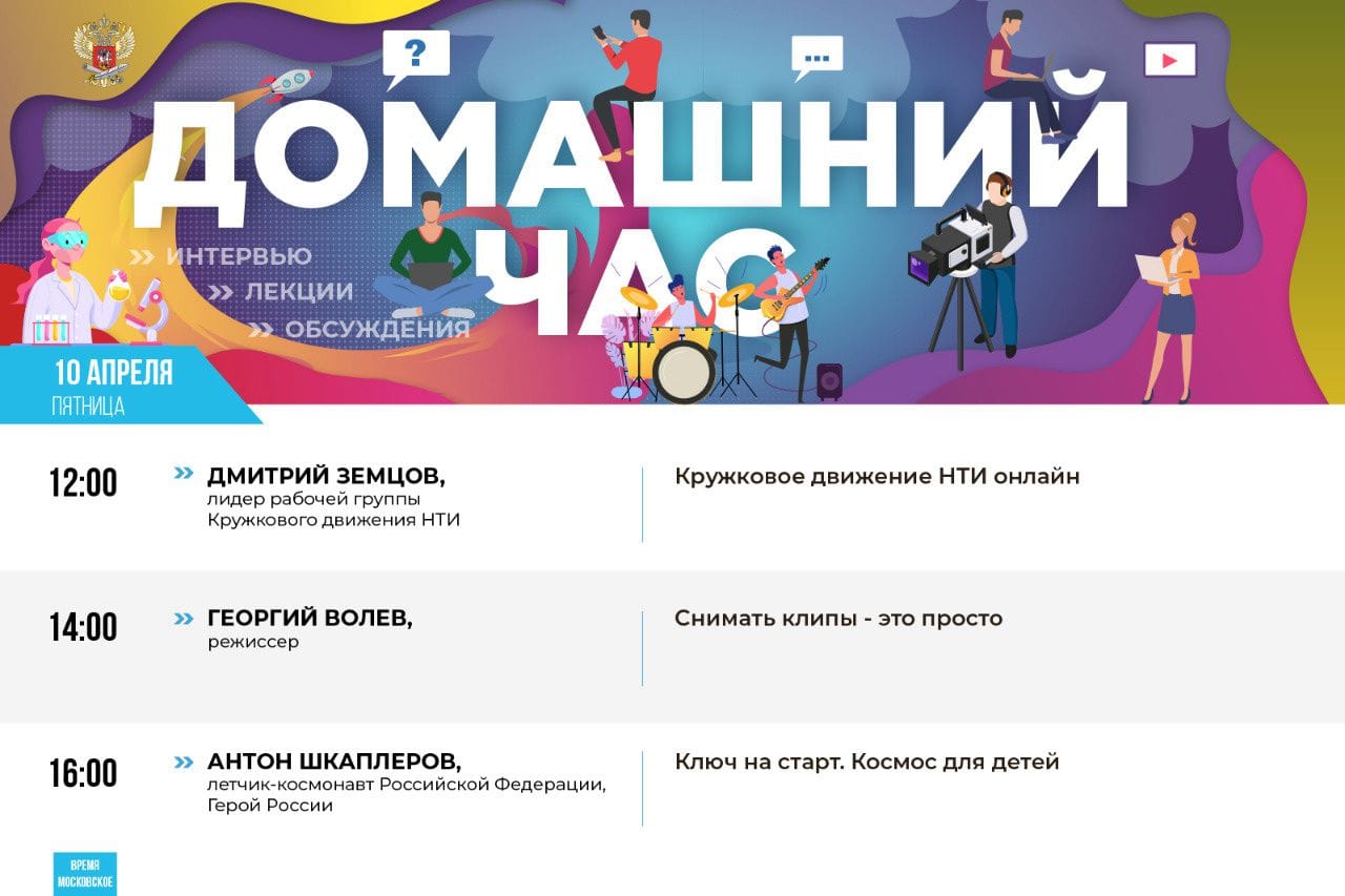 Спикером «Домашнего часа» в 14:00 станет летчик-космонавт, Герой России Антон Шкаплеров. Его тема – «Ключ на старт. Космос для детей».