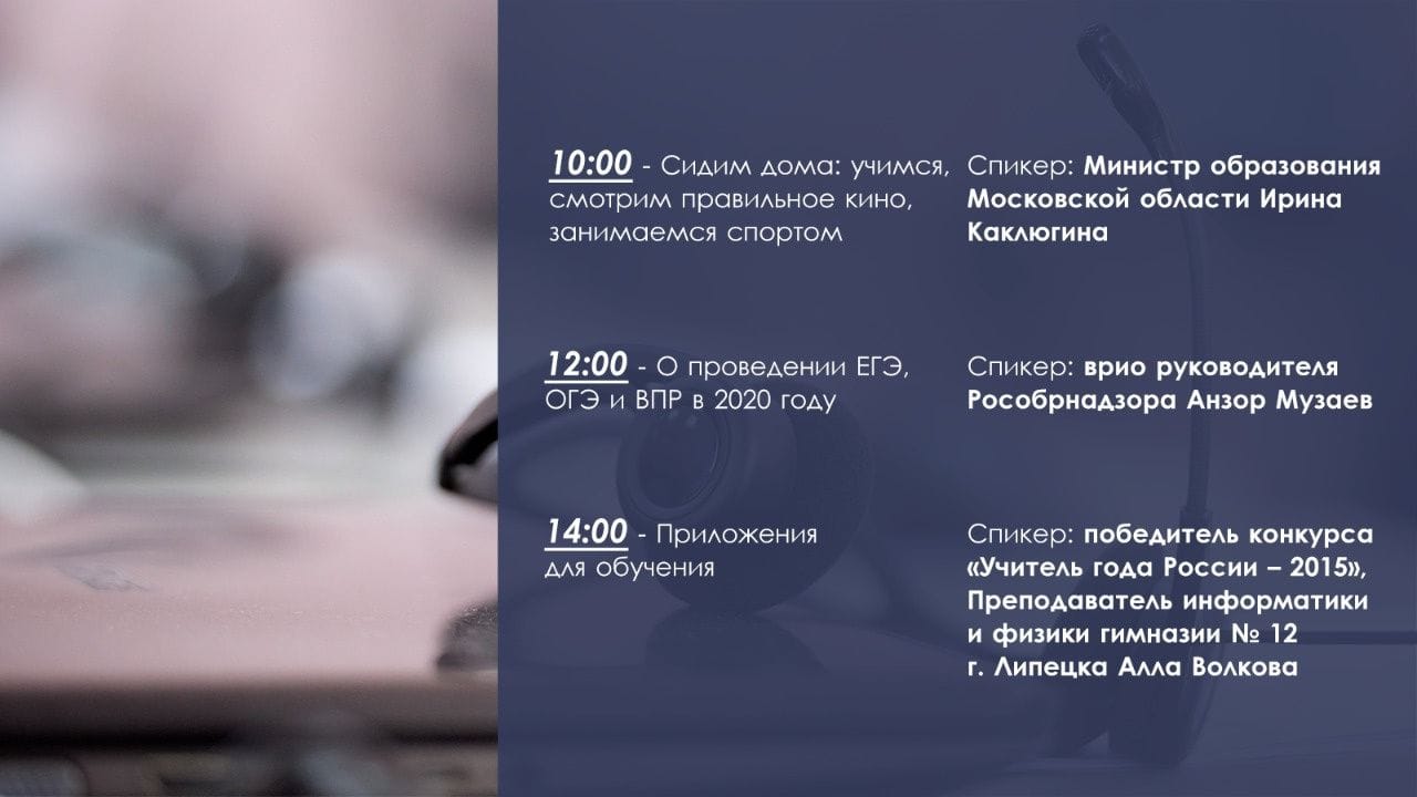 Также сегодня в 12:00 в онлайн-марафоне примет участие временно исполняющий обязанности руководителя Рособрнадзора Анзор Музаев. Он расскажет о том, как и в какие сроки пройдут в 2020 году ЕГЭ и ОГЭ, как готовиться к экзаменам дома, как школы будут проводить всероссийские проверочные работы. Ведущим эфира выступит Роман Плюсов.